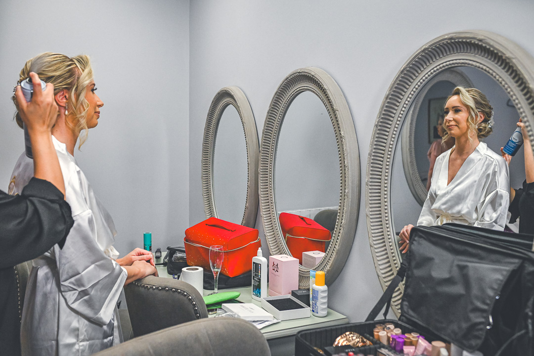 Both Carian & Luke got ready on-site at Ashton Lodge, which means no stressful travel logistics – just smooth vibes and a few early flutters. Upstairs, Carian and her bridal gang were in full prep mode. Laughter, prosecco, maybe a happy tear or two. Hair pins flying, dresses steaming, and Spotify bangers on shuffle.